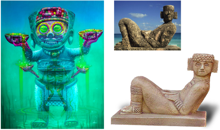 Néanmoins, ces personnages gardent leur aspect bizarre et simple venu directement des témoignages artistiques qu’il nous reste, visibles dans les musées ou ruines archéologiques qui peuplent le Mexique, et que les Européens prirent à tort pour des formes naïves et simplistes, mais qui est en réalité une abstraction poétique renvoyant au monde spirituel des dieux ; il serait vain de vouloir associer à ces créatures mystiques des formes humaines ou tenter de les dessiner fidèlement.